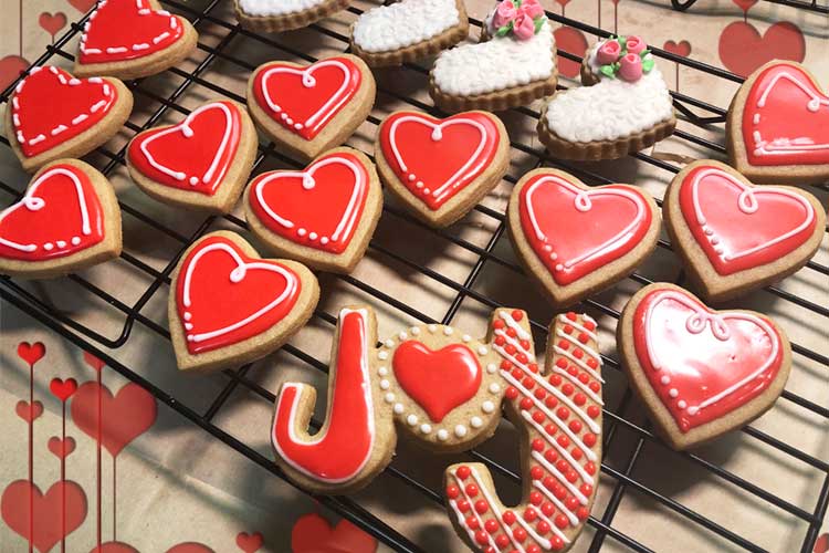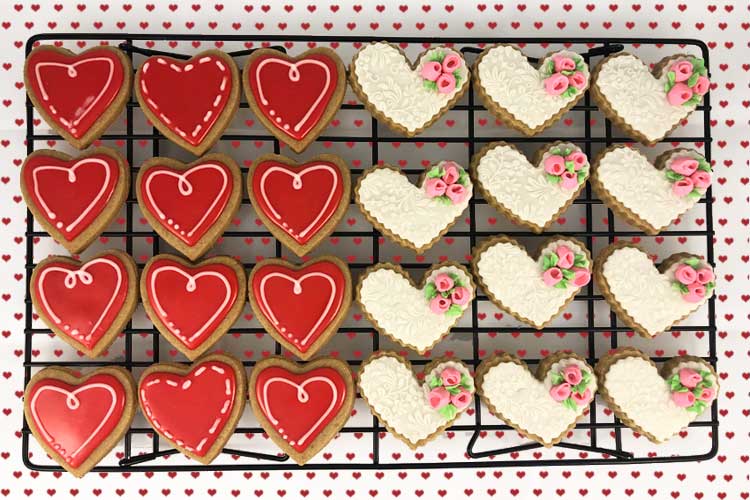 Vanilla Glaze: This glaze/icing dries hard enough that you can stack or package the cookies without damaging the embellishments. But it also dries smooth and a bit shiny, which I love. For this project I used thick red glaze to cover and decorate some of the hearts and I also used Royal Icing to embellish several of the other cookies.