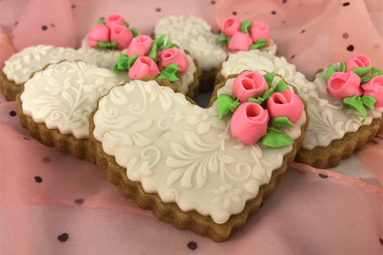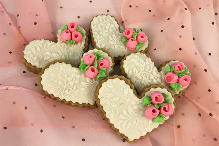 Brown-Butter Cookies. Made with brown butter, which gives them a deep, rich caramelized flavor, these cookies are unique and delicious. Thank you, Sugar Hero, for this delicious recipe. For the icing and decorations, I used a mixture of glaze (love the shine), royal icing (perfect for the pink roses), and white chocolate dough mixed with homemade fondant for the embossed hearts.